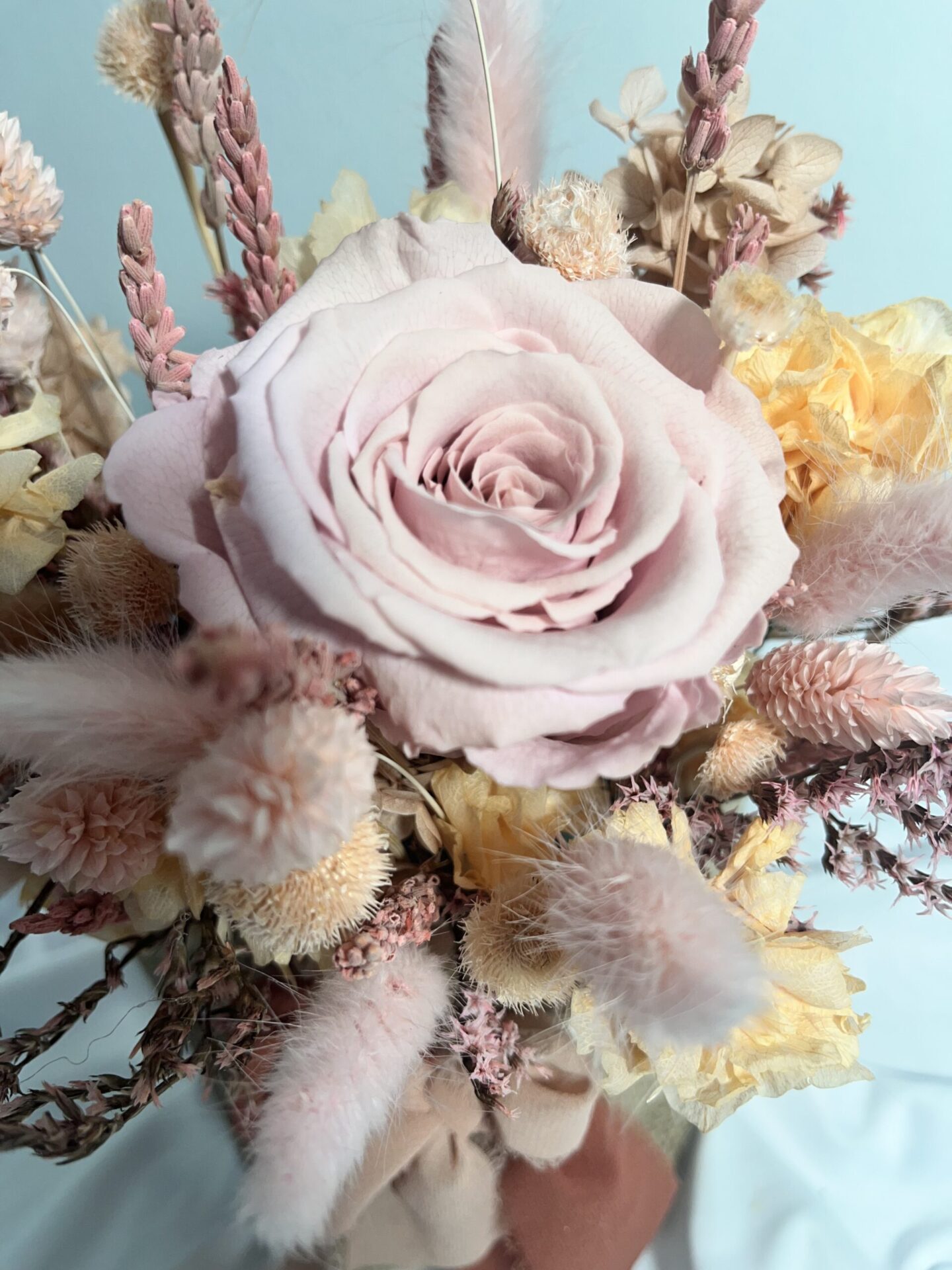 - Elaborada con flores preservadas de larga duración.